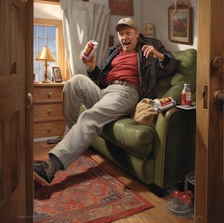 [Midjourney rendition of getting off the couch to go get a beer from the fridge, happy]