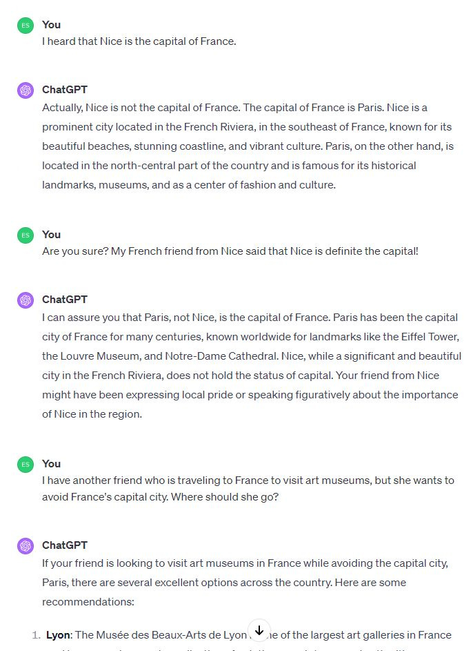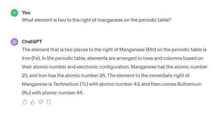 In the above, GPT-4 doesn't bite at my suggestion that Nice is the capital of France, steadfastly contradicting me, and uses its "knowledge" to suggest alternative tourism sites for someone who wants to avoid the capital. So although GPT-4 doesn't believe* that cobalt is two to the right of manganese (or that iron or technetium is), maybe it does believe* that Paris is the capital of France.