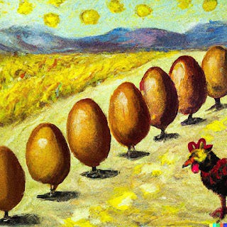 [Dall-E image of a series of chickens and eggs, in the style of Van Gogh]